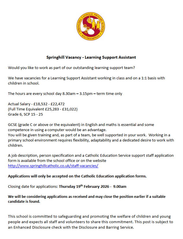 Springhill Catholic Primary School are committed to safeguarding and promoting the welfare of children and young people and expect all staff and volunteers to share this commitment. We will ensure that all our recruitment and selection practices reflect this commitment. All successful candidates will be subject to Disclosure and Barring Service checks along with other relevant employment checks.